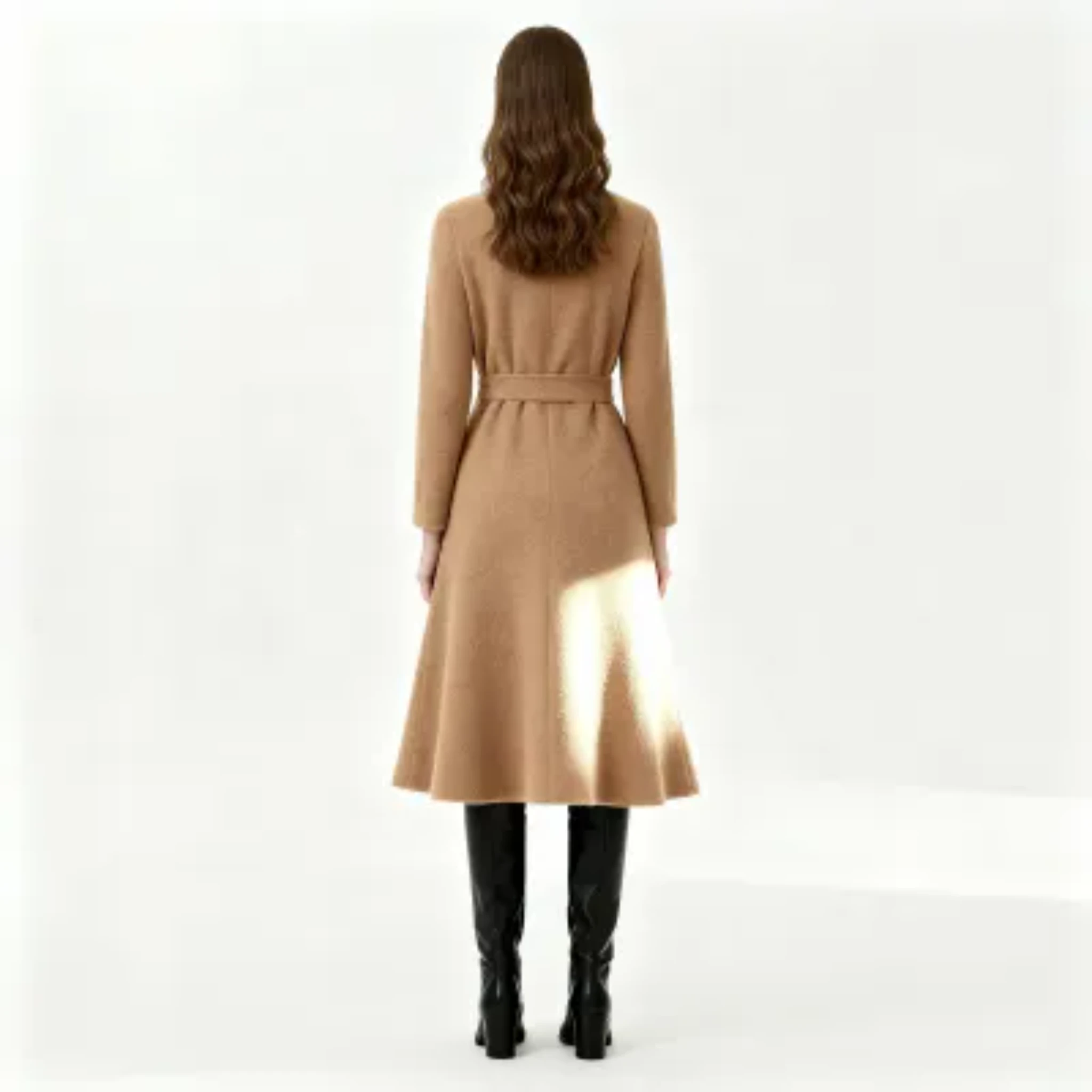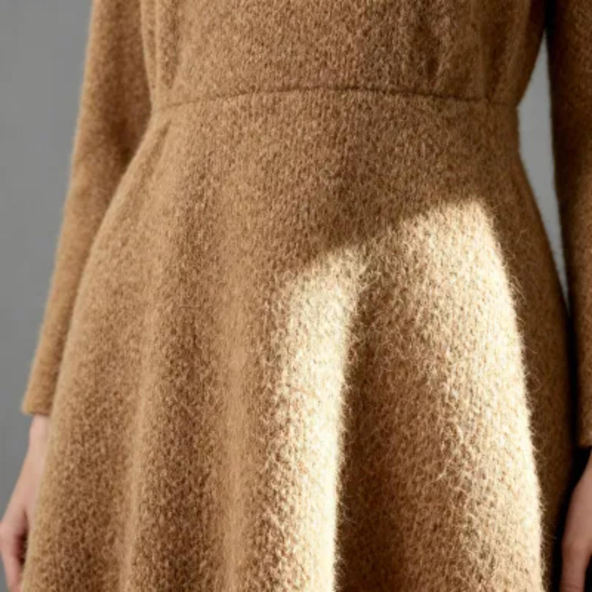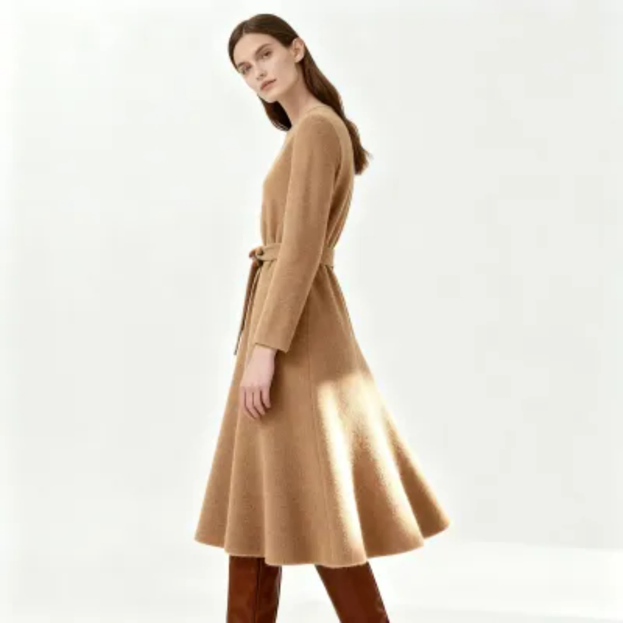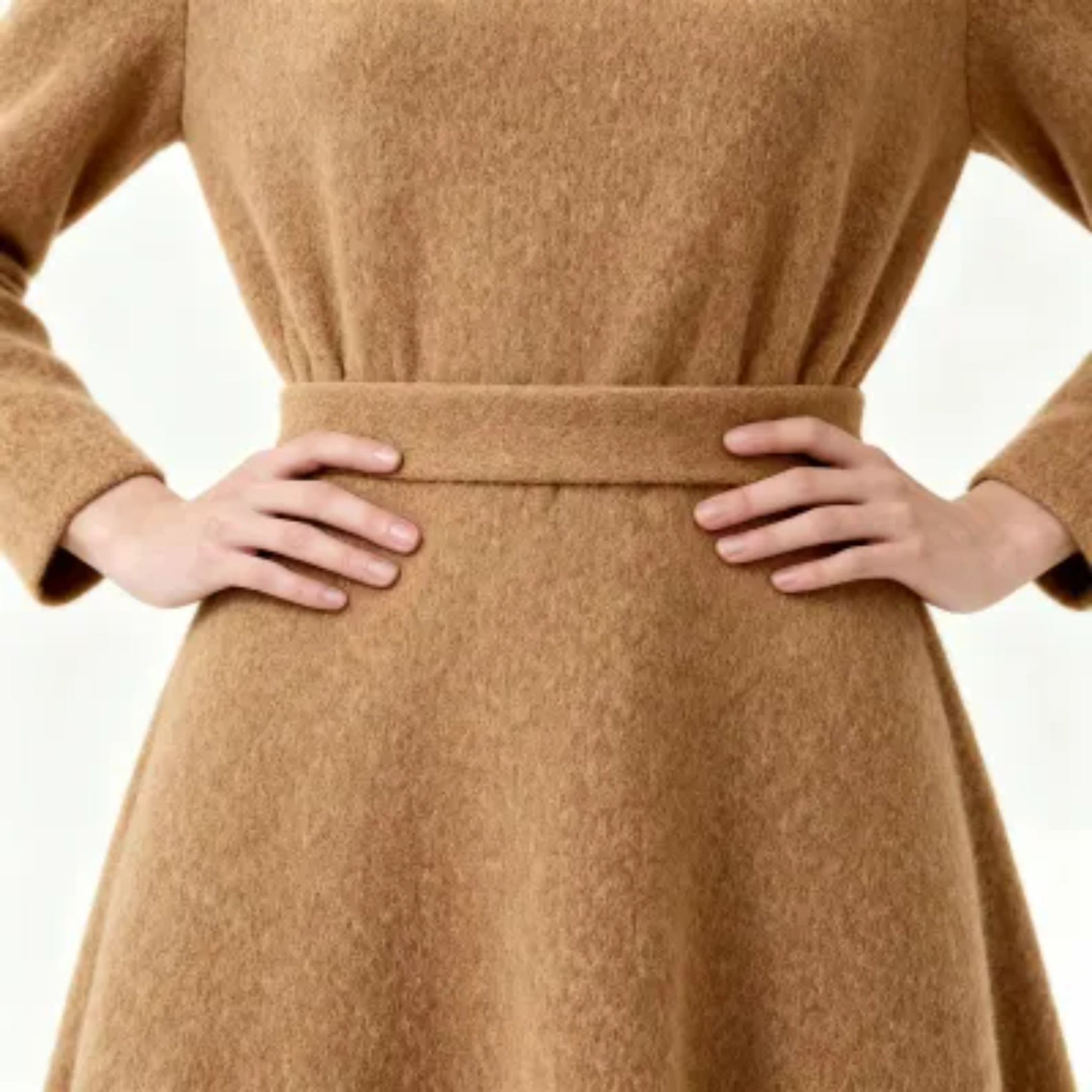 Step into effortless elegance with this A-line woolen midi dress, designed to flatter every silhouette. Made from a soft wool-blend fabric, it provides cozy warmth while keeping a lightweight feel, perfect for autumn layering. The classic A-line cut cinches gently at the waist and flows into a graceful hemline, offering both comfort and style. Its versatile camel shade makes it easy to pair with coats and boots, whether for a day at the office or a casual weekend stroll.
