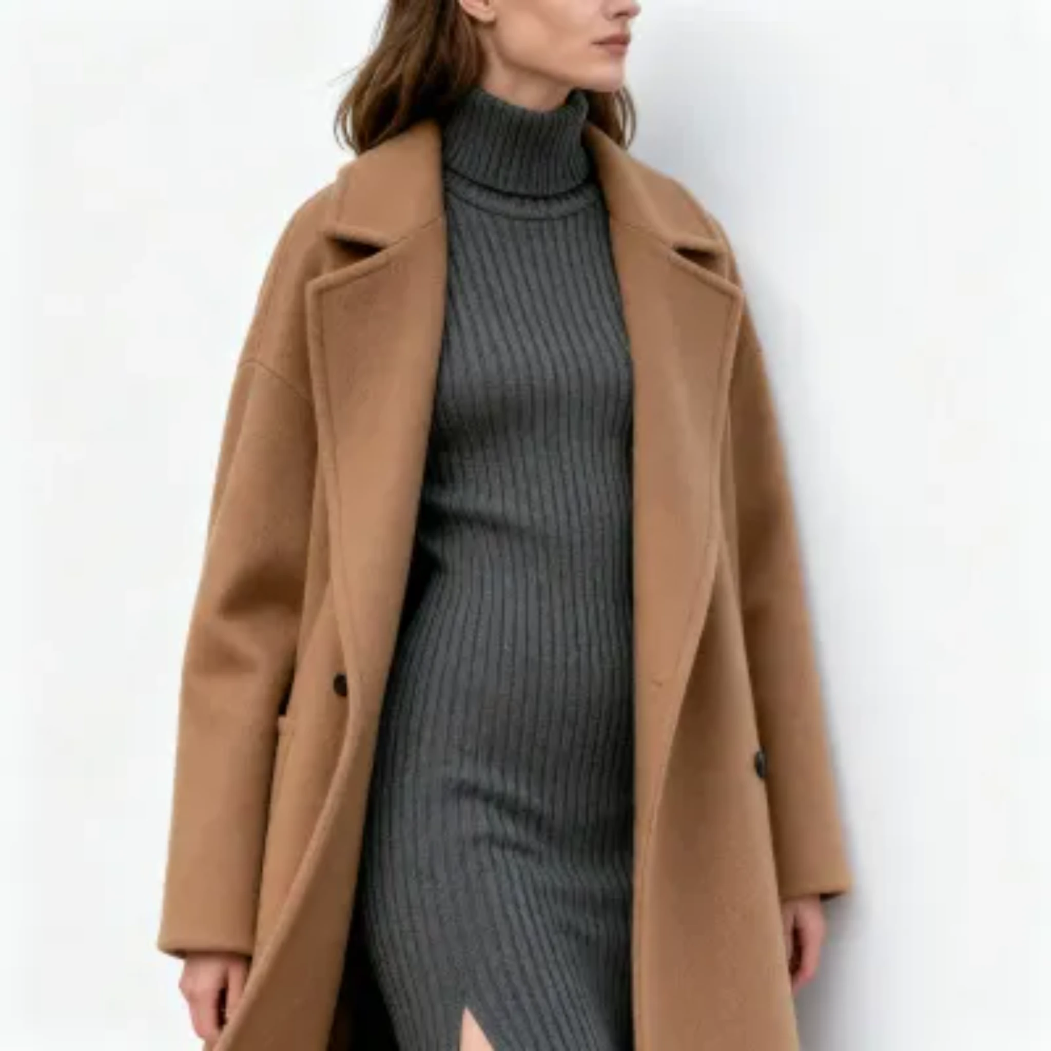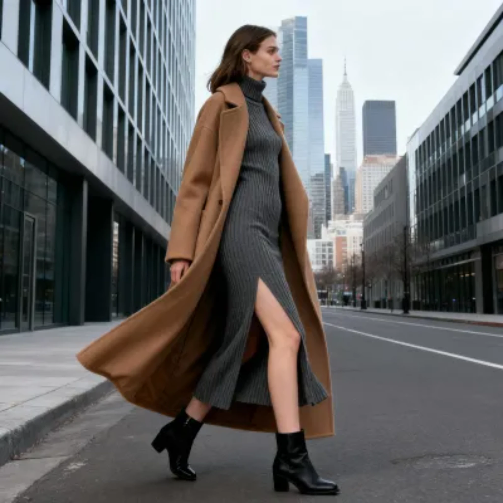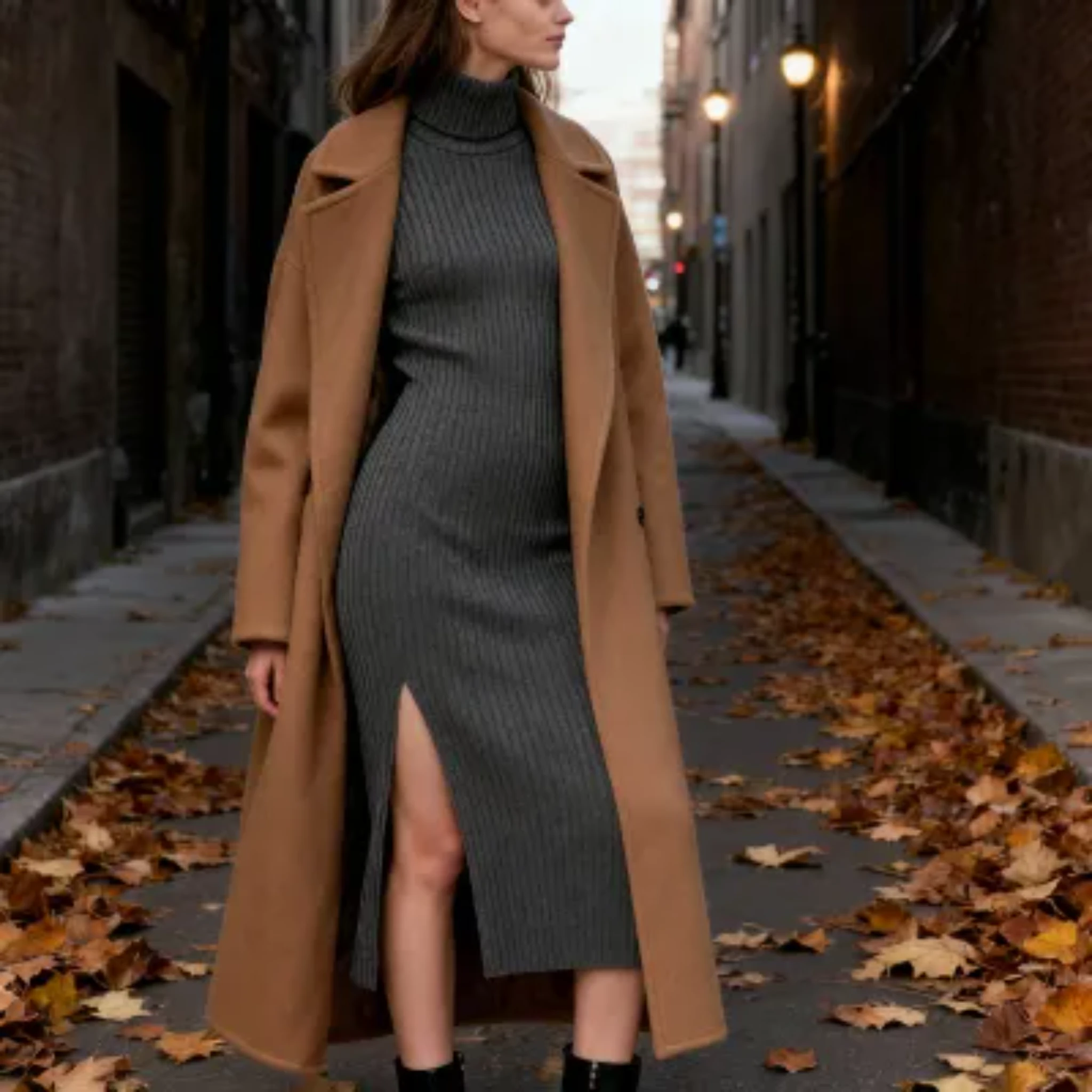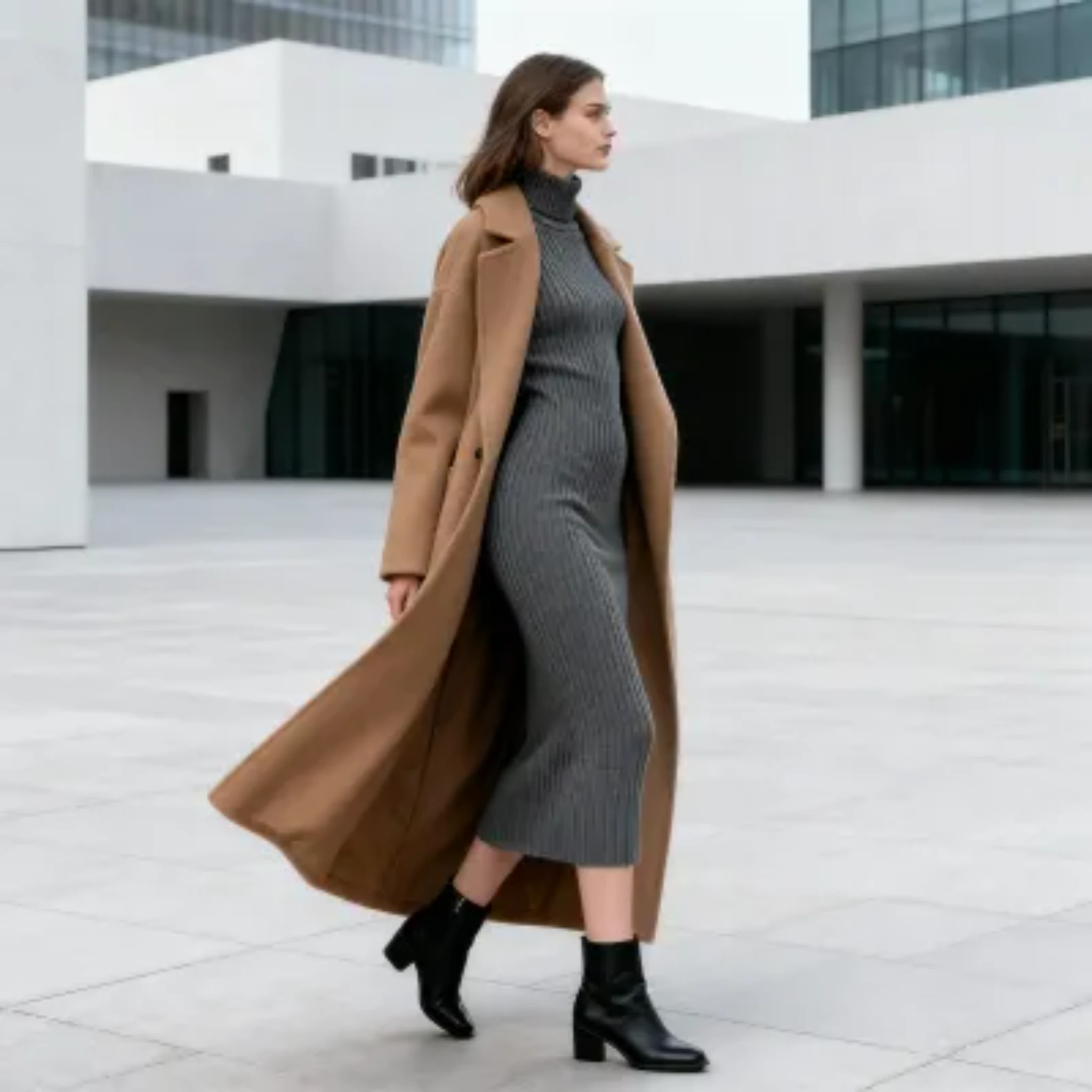 Modern and effortlessly chic, this high-neck knit dress is a seasonal must-have. Made from a ribbed knit fabric, it hugs the body in all the right places while offering comfort and stretch. The sleek high neckline adds a polished finish, and the side slit detail gives the dress a contemporary edge, making it both stylish and easy to move in. Its charcoal grey color serves as a versatile base for layering — pair it with a tailored coat and boots for city-ready sophistication, or keep it minimal for an understated, elegant winter look.