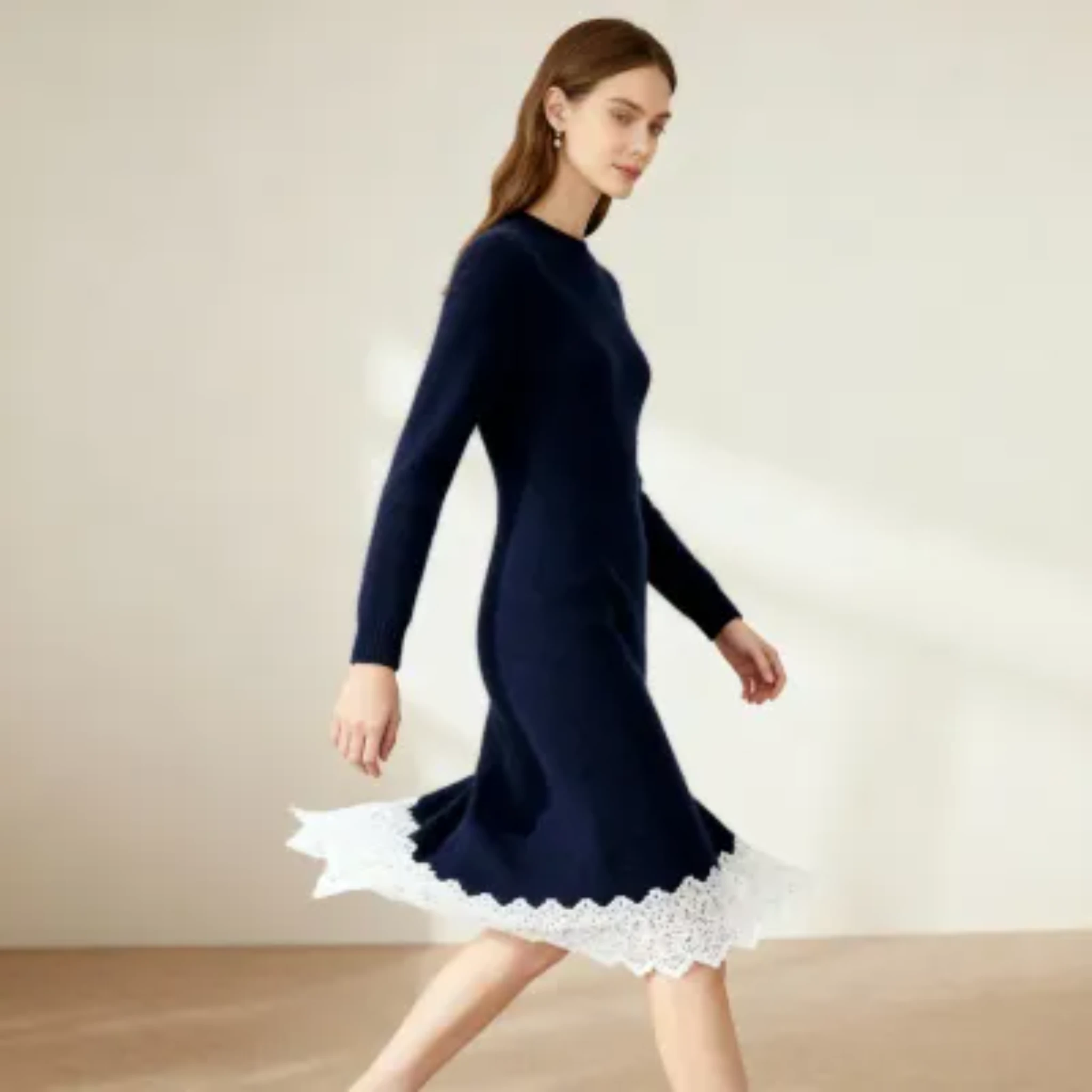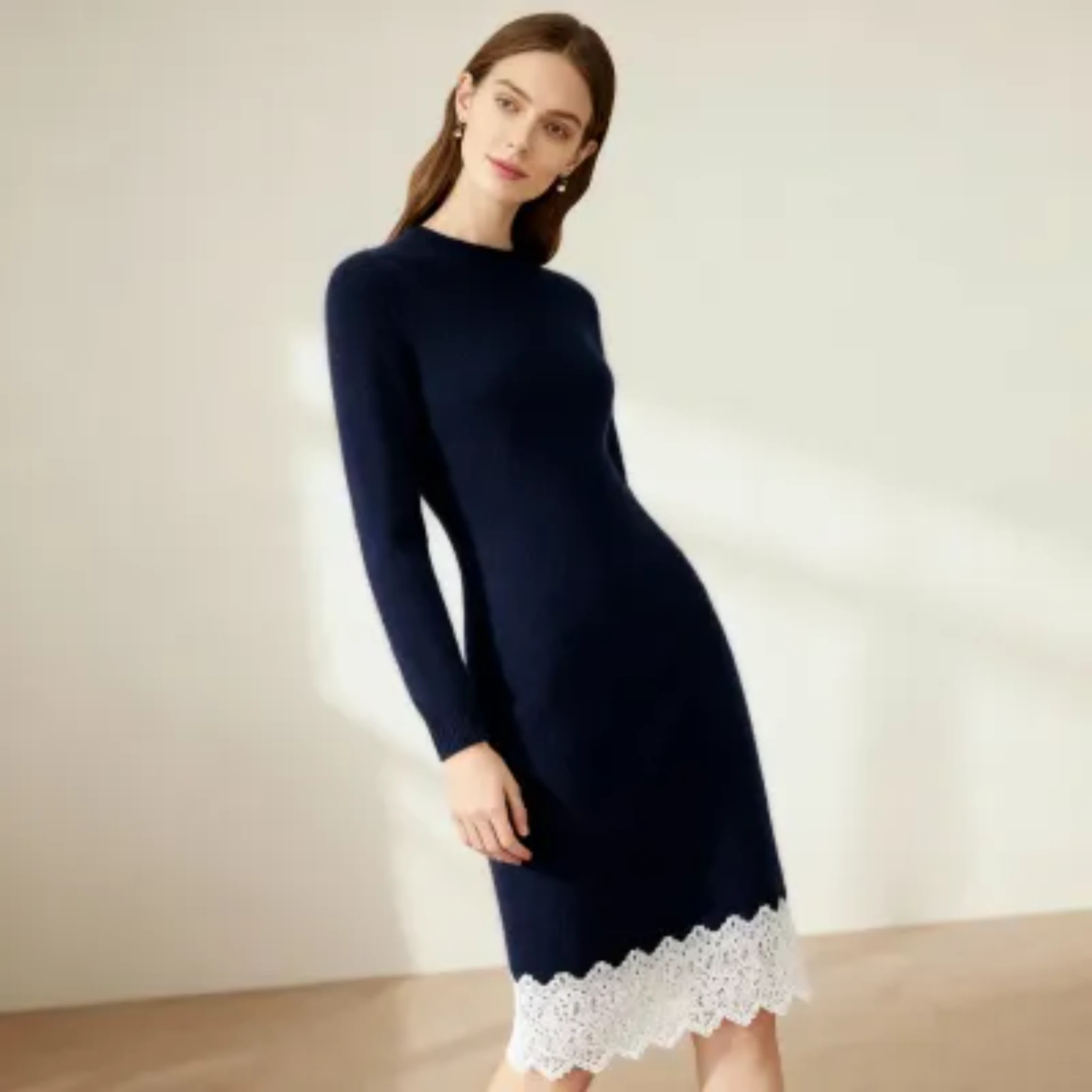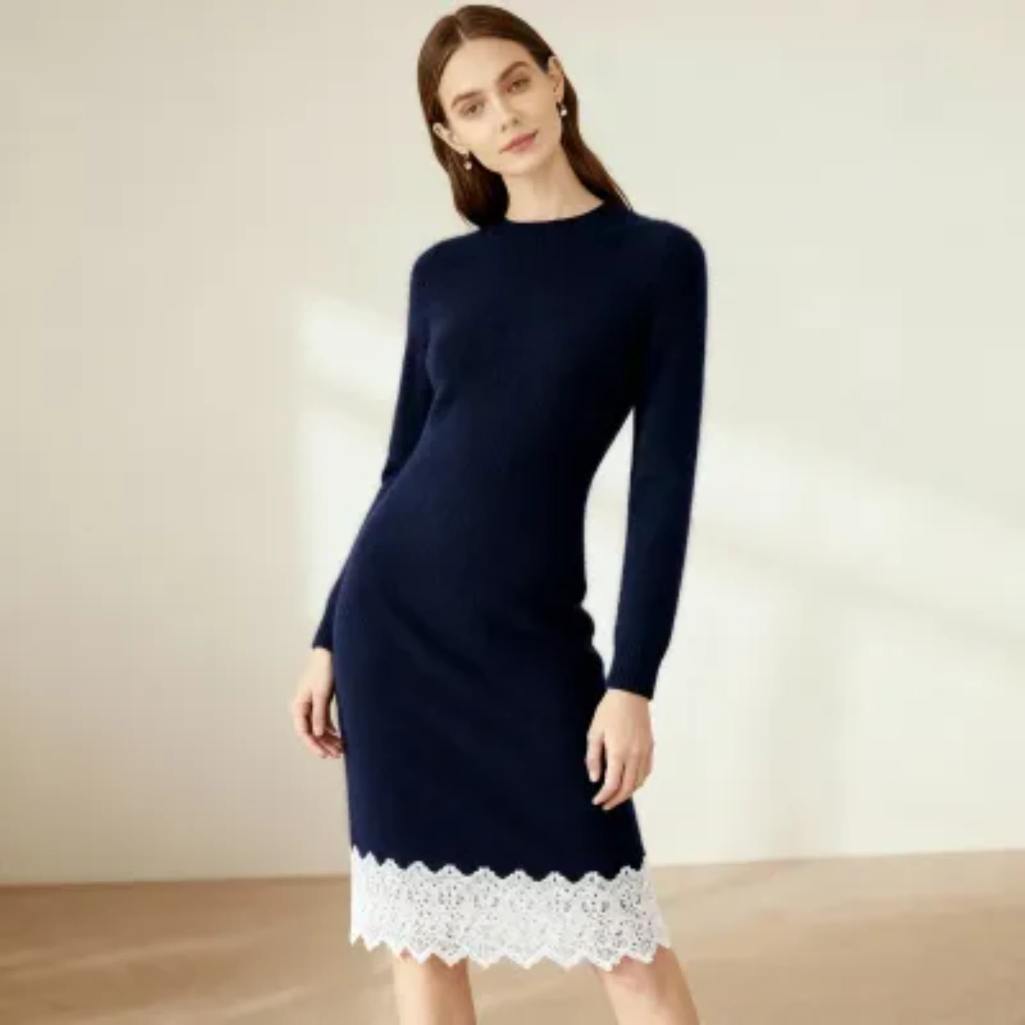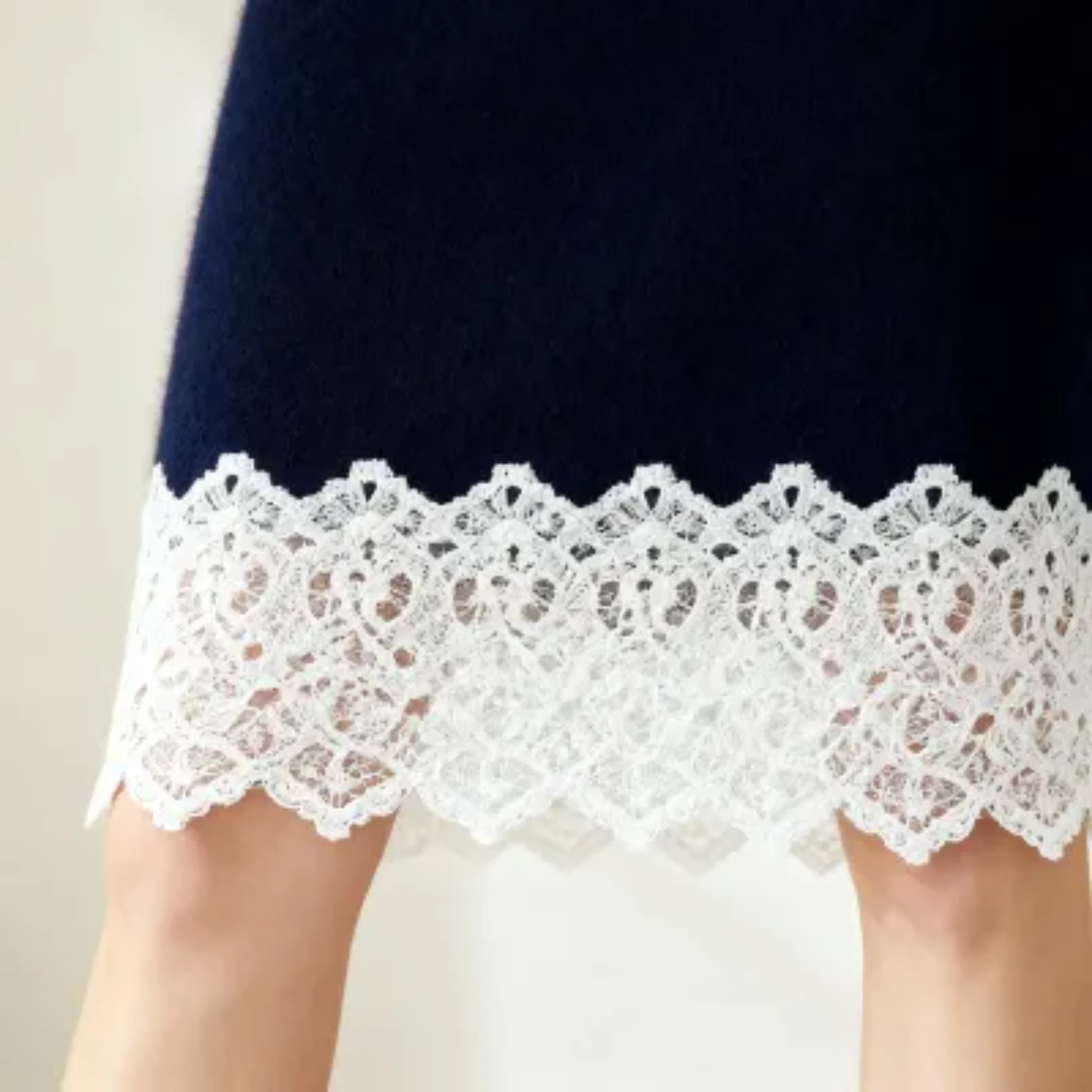 Embrace feminine elegance with this knit dress featuring a delicate lace hem. Crafted from a cozy wool-blend knit, it provides warmth for cooler days while maintaining a graceful silhouette. The midi length and slim shape elongate the figure, while the lace trim adds a romantic touch that softens the overall look. Its deep navy shade brings a refined, versatile edge — perfect for workdays, dinners, or semi-formal gatherings. Easy to style, this dress transitions seamlessly from day to night, making it a timeless addition to your autumn-winter wardrobe.