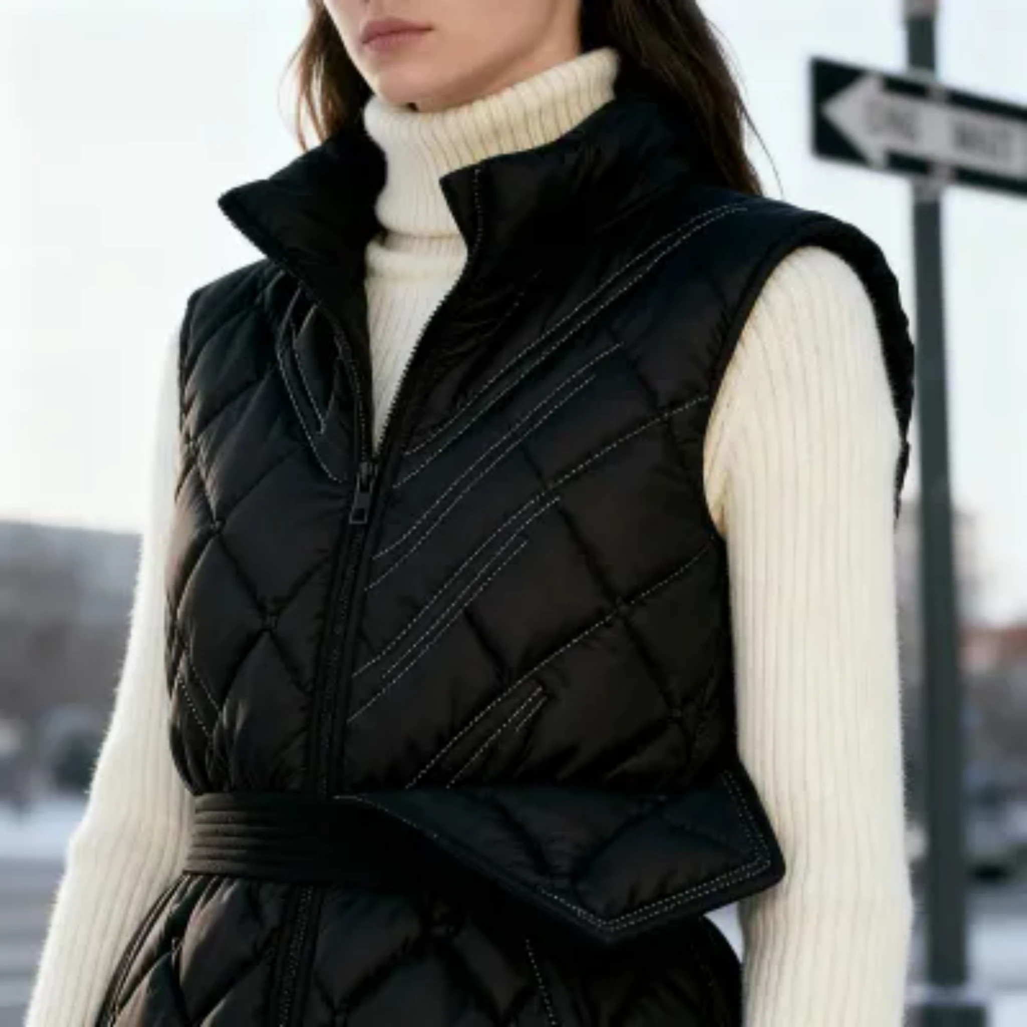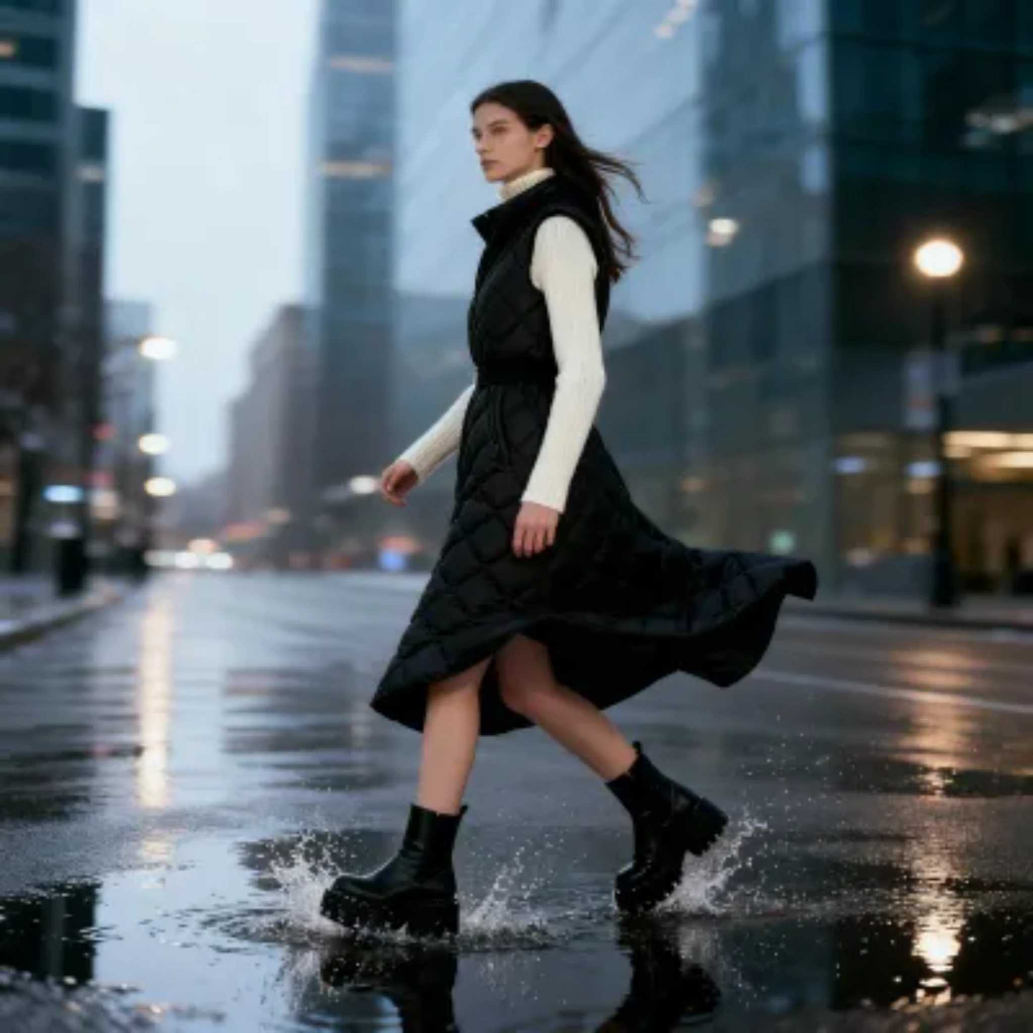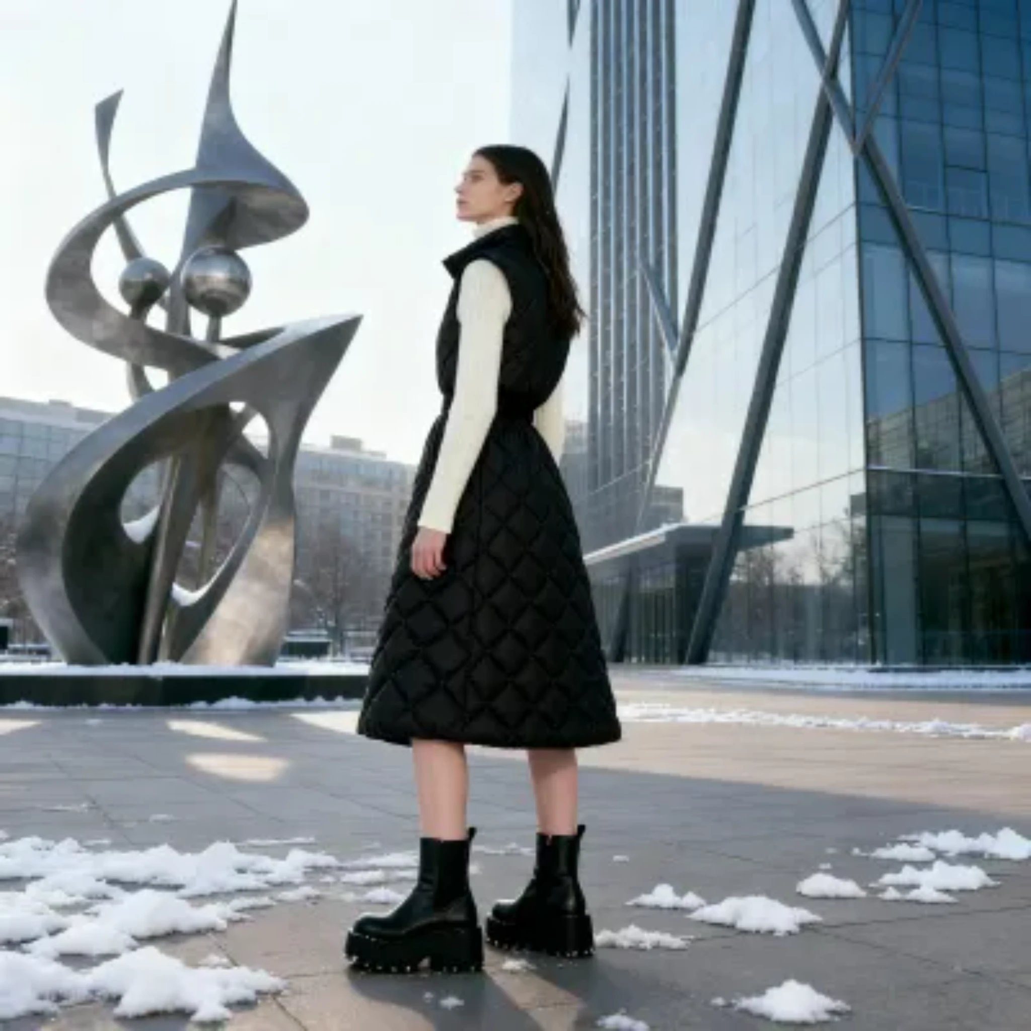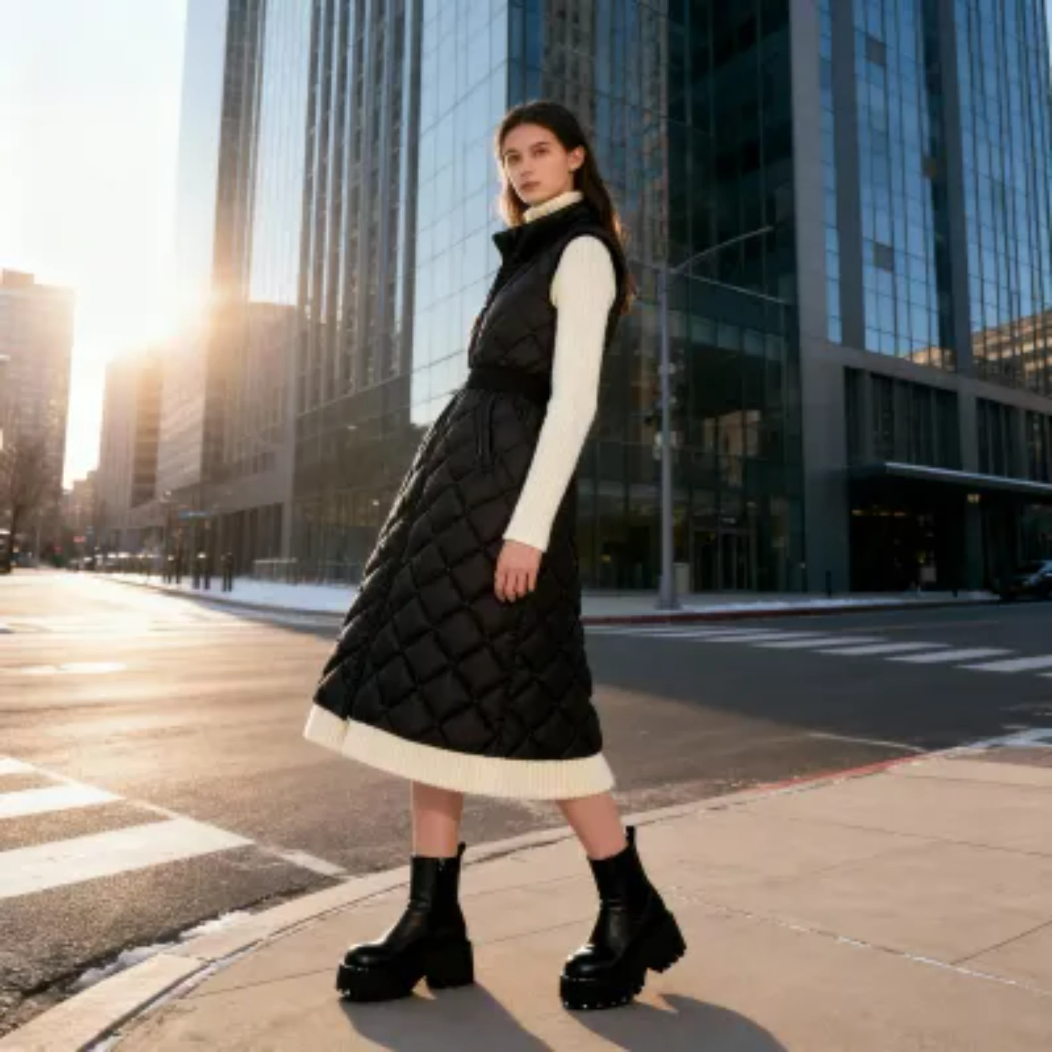 Make a bold statement this season with the quilted puffer vest dress, a fresh take on winter street style. Designed with an oversized silhouette, this sleeveless piece layers easily over knitwear, creating a fashion-forward look that blends comfort with edge. The quilted fabric adds structure and warmth without weighing you down, while the black color ensures versatility and urban chic appeal. Perfect for styling with chunky boots and turtlenecks, this dress delivers a contemporary twist to classic cold-weather dressing.