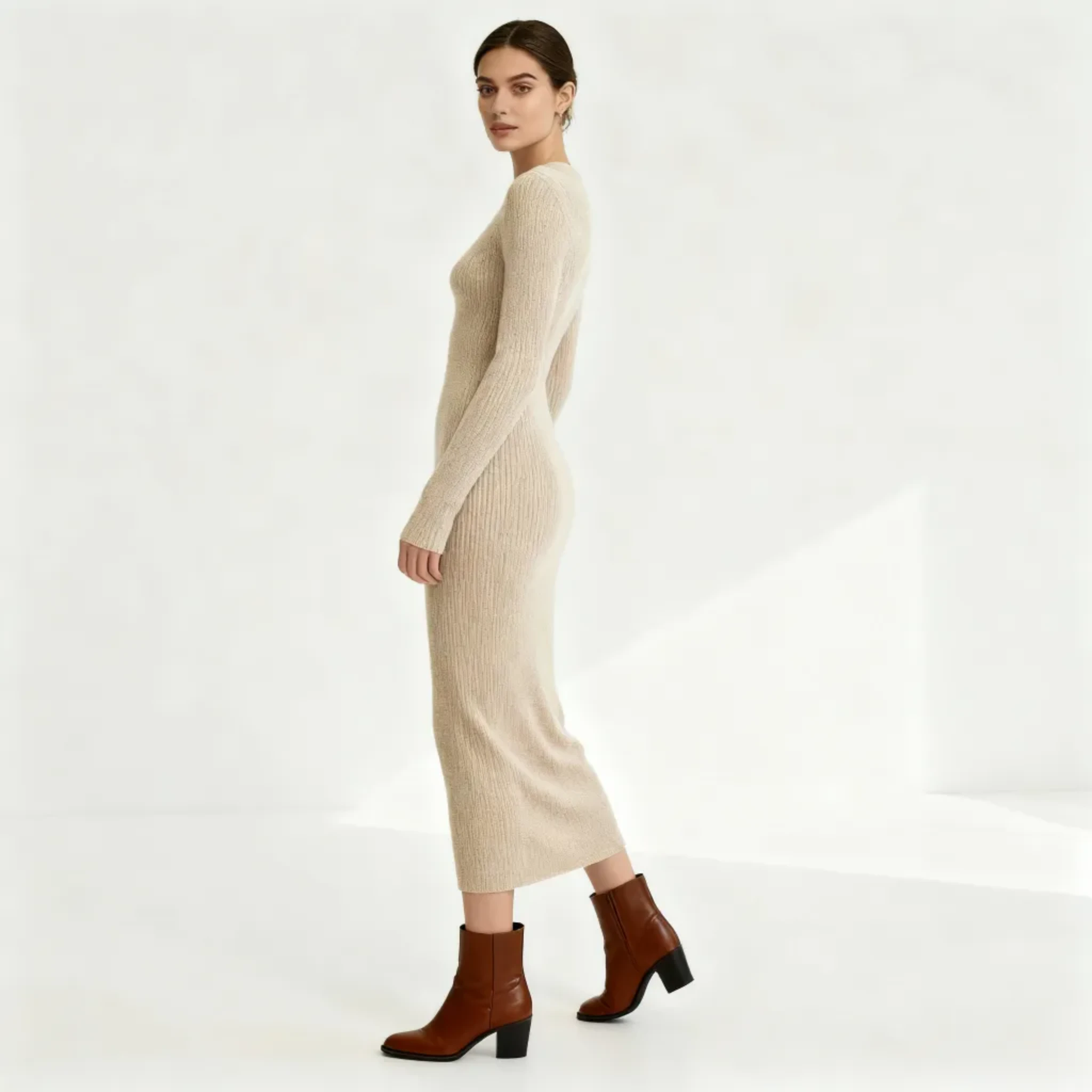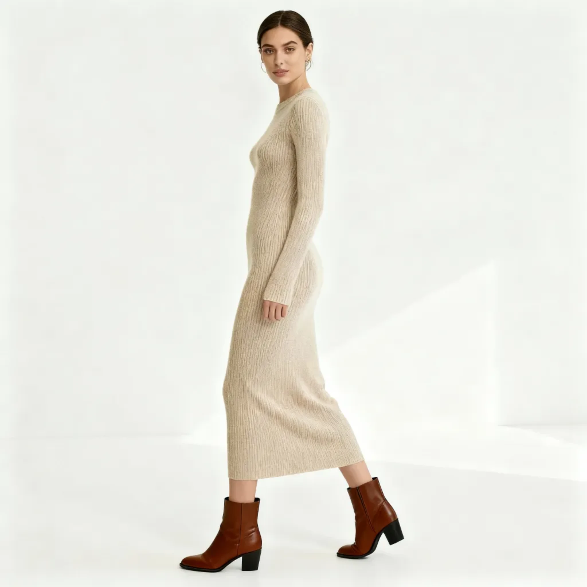Elevate your autumn-winter wardrobe with this slim-fit wool knit dress, designed to balance elegance and comfort. Crafted from a premium wool blend, it delivers a soft, skin-friendly touch while keeping you warm on cooler days. The body-skimming silhouette highlights natural curves without feeling restrictive, making it a versatile piece for both office wear and casual outings.